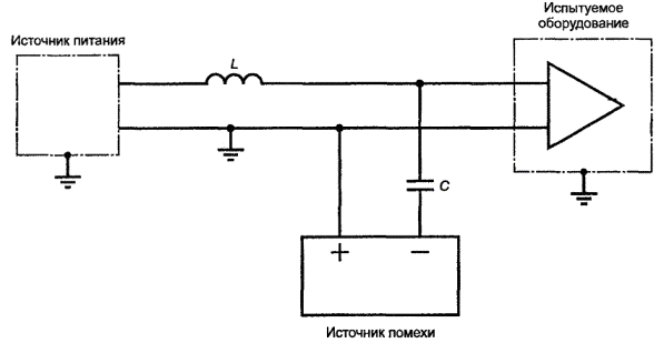 Рисунок 9 - Схема соединений при испытаниях на устойчивость к затухающему колебательному напряжению 8.3.7 Проверка параметров источников питания переменного и постоянного тока Выполняют процедуры проверки правильности функционирования по 8.3.2.2 во время испытаний по 8.3.7.1 - 8.3.7.3. 8.3.7.1 Испытания на изменения частоты и входного напряжения источника питания 8.3.7.1.1 Испытание на устойчивость к изменению частоты и напряжения Таблица 47 - Устойчивость к изменению напряжения и частоты (см. примечание 1)