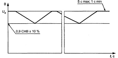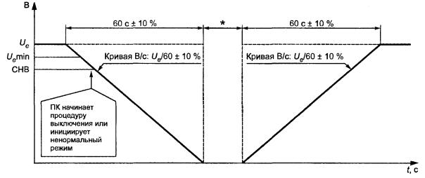 Испытание С - Медленные изменения напряжения электропитания Рисунок 11 - Испытания на устойчивость функционирования при изменениях внешнего электропитания 8.3.7.4 Испытания на несоответствующее подключение источника питания Согласно 5.2.3, перечисление 5. 8.3.7.4.1 Испытание на изменение полярности источника питания постоянного тока (испытание на стойкость) Номинальное напряжение обратной полярности должно подаваться в течение 10 с. Результаты должны соответствовать условиям, заявленным изготовителем (например, перегорание плавкого предохранителя). После испытания базовая конфигурация ПК должна пройти процедуру проверки (см. 8.3.2.2). Защитные устройства, например плавкие предохранители, могут заменяться до проверки. 8.3.7.4.2 Испытание на несоответствующее значение напряжения и/или частоты Для значений напряжения выше максимального Uмакс или/и частот, выходящих за пределы Fn макс и Fn мин для рабочих условий эксплуатации, испытание должно согласовываться между пользователем и изготовителем. 8.3.7.5 Проверка параметров резервного питания памяти 8.3.7.5.1 Испытание на длительность сохранения резервного питания Таблица 52 - Испытание на длительность сохранения резервного питания