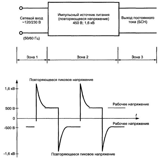 Примечания 1 Пути утечки приведены для действующих значений напряжений переменного или постоянного тока, не содержащих импульсных составляющих. Для условий микросреды, когда могут иметь место импульсные напряжения, следует применять другие требования: - для категории установок II пути утечки не должны быть менее значений соответствующих воздушных зазоров (см. 6.3.1); - пути утечки и воздушные зазоры для напряжений высокой частоты, генерируемых импульсными источниками питания, должны быть рассчитаны по таблице 24. 2 Действующее значение напряжения переменного тока синусоидальной или несинусоидальной формы. 3 Защитное покрытие должно прочно держаться на изоляционном материале платы для предотвращения проникновения влаги и загрязнения, а также для обеспечения устойчивости к перенапряжениям, указанным в 5.10.2. 4 Защитное покрытие печатной платы применимо к материалам всех групп и степеням загрязнения 1 - 3. 5 Не требуется проводить испытания, если изготовитель предоставляет доказательства того, что защитное покрытие прошло испытание, указанное в 6.3.5.5.7, или другое эквивалентное испытание, проведенное независимой лабораторией. 6 Плата с покрытием, но без компонентов должна выдерживать испытательное напряжение диэлектрической прочности изоляции в соответствии с 5.10.2. 7 Степень загрязнения 1 - для материалов всех групп. 8 Степень загрязнения 2 - для материалов I, II, IIIa групп. 9 Пути утечки и воздушные зазоры между цепями должны быть такими, чтобы соответствовать наиболее высокому рабочему напряжению и напряжению диэлектрической прочности. Максимальные значения повторяющихся пиковых напряжений в условиях нормальной работы должны быть ограничены значениями согласно 6.3.3.2 с целью предотвращения ослабления диэлектрических свойств изоляции частичными разрядами. 6.3.3.2 Требования к путям утечки для повторяющихся пиковых напряжений 6.3.3.2.1 Общие положения Явления частичных разрядов имеют место на поверхности, подвергающейся длительному воздействию влажности и повторяющихся пиковых напряжений (импульсов). Эти пиковые воздействия воздействуют на малые зоны между проводниками, которые затем пробиваются, порождая небольшие области протекания зарядов. В итоге возникает объединение зарядов между проводниками и происходит пробой изоляции. Значения, указанные в таблице 24, применяют для предотвращения частичного разряда для степеней загрязнения 1 - 3 поверхности диэлектрика. 6.3.3.2.2 Требования к путям утечки для повторяющихся пиковых напряжений Кроме требований к воздушным зазорам и путям утечки, приведенным в предыдущих пунктах, при наличии повторяющихся пиковых напряжений должны также быть выполнены требования к путям утечки, указанным в таблице 24. Таблица 24 - Минимальные пути утечки на печатных платах без покрытия при наличии повторяющихся пиковых напряжений (для степеней загрязнения 1 - 3, см. примечание 1)