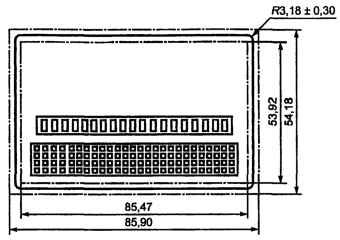 Рисунок 1 - Размеры карты формата ID-1 без тиснения 5.1.2 Толщина Толщина карты должна быть (0,76 + 0,08) мм (см. рисунок 1). 5.1.3 Углы Углы карты должны иметь радиус скругления (3,18 ± 0,30) мм. Дуги и прямолинейные участки кромок карты должны плавно сопрягаться. 5.1.4 Кромки Заусенцы на кромках карты, нормальные к ее поверхности, не