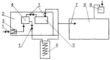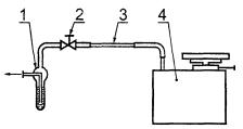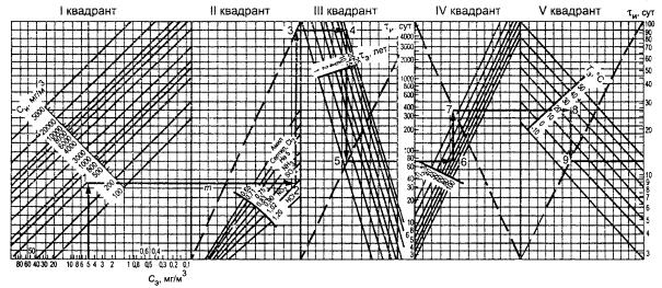 Б.5.14.3.3 Отбор проб Для отбора проб собирают систему, схема которой приведена на рисунке Б.2. 1 - поглотитель с 0,05 н. раствором едкого натра; 2 - кран двухходовой; 3 - капилляр, обеспечивающий скорость отбора пробы 0,2 л/мин; 4 - прибор типа УГ-2 для отбора пробы Рисунок Б.2 - Схема устройства для отбора проб амила Отсоединяют поглотитель; шток, соответствующий объему отбираемой пробы 400 мл, вставляют в гнездо прибора для отбора проб, вдавливают до упора и закрепляют в этом положении зажимным винтом; подсоединяют поглотитель, содержащий 10 мл 0,05 н. раствора едкого натра, и подключают к месту отбора проб. Отпускают шток. После прекращения проскакивания пузырьков через поглотительный раствор поглотитель отсоединяют. Б.5.14.3.4 Определение концентрации амила Из поглотителя отбирают от 0,2 до 0,4 мл раствора в колориметрическую пробирку и разбавляют его раствором 0,05 н. едкого натра до 5 мл. Затем к пробе приливают 1 мл реактива Грисса-Илосвая и взбалтывают. Через 15 мин полученную окраску сравнивают с окраской имитирующей шкалы. Б.5.14.3.5 Обработка результатов Концентрацию амила X2, г/м3, вычисляют по формуле X2 = (2aV) / (V1V0), (Б.8) где а - количество амила, найденное при колориметрировании, г; V - объем пробы, взятой для анализа, м3; V1 - объем пробы в поглотителе, м3; V0 - объем отобранной пробы, приведенный к условиям по ГОСТ 2939, м3. При получении окрасок интенсивнее, чем окраска последней ампулы имитирующей шкалы, раствор разбавляют 1:10 0,05 н. раствором едкого натра. В этом случае в числитель формулы (Б.8) вводят множитель 10. ПРИЛОЖЕНИЕ В(обязательное) Метод определения параметров режима испытания изделий на стойкость к воздействию агрессивных средПараметры испытательного режима для изделий по 5.3.6, примечание к таблице 1, и по 5.3.7.4 настоящего стандарта определяют по номограмме, приведенной на рисунке В.1. Номограмма построена в пяти горизонтально сопряженных квадрантах. Во втором, третьем и пятом квадрантах из начала координат в верхний правый угол, а в четвертом квадранте в нижний правый проведены пунктирные линии - направляющие прямые. В первом квадранте номограммы на горизонтальной шкале указаны возможные значения массовой концентрации агрессивных сред в эксплуатации Сэ, мг/м3, каждая наклонная линия соответствует определенному значению массовой концентрации агрессивной среды при испытании Си, мг/м3. Во втором квадранте каждая наклонная линия соответствует коэффициенту m, определенному для конкретной агрессивной среды. В третьем квадранте каждая наклонная линия соответствует возможному значению продолжительности воздействия агрессивной среды при эксплуатации τэ лет. На вертикальной шкале указана продолжительность испытания изделия τи, сут, при заданной продолжительности τэ, получаемая при форсировании только массовой концентрации агрессивной среды. Если продолжительность испытаний τи получилась более 100 сут, то уменьшение этой продолжительности до желаемого значения получают увеличением значений температуры и относительной влажности агрессивной среды при испытании по отношению к их эффективным значениям при эксплуатации. Если испытания проводят при форсировании только концентрации, то значения температуры и относительной влажности при испытании должны соответствовать их эффективным значениям при эксплуатации, установленным в стандартах или ТУ на