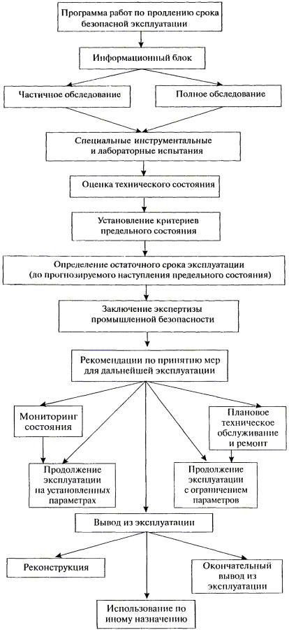 Утверждены постановлением Госгортехнадзора России от 05.06.03 № 66, зарегистрированным Министерством юстиции Российской Федерации 16.06.03 г., регистрационный № 4687 МЕТОДИЧЕСКИЕ УКАЗАНИЯ РД 06-565-03 * Печатаются по «Российской газете» от 21 июня 2003 г., № 120/1. I. ВВЕДЕНИЕ1. Методические указания о порядке продления срока службы технических устройств, зданий и сооружений с истекшим нормативным сроком эксплуатации в горнорудной промышленности (далее - Указания) разработаны в соответствии с Федеральным законом от 21.07.97 № 116-ФЗ «О промышленной безопасности опасных производственных объектов» (Собрание законодательства Российской Федерации, 1997, № 30, ст. 3588); постановлением Правительства Российской Федерации от 28.03.01 № 241 «О мерах по обеспечению промышленной безопасности опасных производственных объектов» (Собрание законодательства Российской Федерации, 2001, № 15, ст. 1489) и Положением о порядке продления срока безопасной эксплуатации технических устройств, оборудования и сооружений на опасных производственных объектах (РД 03-484-02), утвержденным постановлением Госгортехнадзора России от 09.07.02 № 43, зарегистрированным Минюстом России 05.08.02 г., регистрационный № 3665. 2. Указания предназначены для специалистов организаций, эксплуатирующих опасные производственные объекты горнорудной промышленности, и экспертных организаций в целях определения технического состояния и принятия решения о возможности продления срока безопасной эксплуатации (экспертизы промышленной безопасности) технических устройств, оборудования (далее - технические устройства), зданий и сооружений с истекшим нормативным сроком эксплуатации. 3. Указания распространяются на все технические устройства как отечественного, так и иностранного производства, применяемые на опасных производственных объектах горнорудной промышленности. 4. Указания устанавливают порядок проведения экспертизы и разработки программы работ, определяют объем, методы и критерии технического состояния, условия и срок дальнейшей эксплуатации технических устройств, зданий и сооружений, необходимость проведения их ремонта или модернизации. 5. Указания определяют требования к организациям и квалификации специалистов, проводящих экспертизу промышленной безопасности. II. ОБЩИЕ ТРЕБОВАНИЯ6. По достижении установленного срока эксплуатации дальнейшее использование технических устройств, зданий и сооружений без проведения работ (экспертизы) по продлению срока безопасной эксплуатации не допускается [п. 5 Положения о порядке продления срока безопасной эксплуатации технических устройств, оборудования и сооружений на опасных производственных объектах (РД 03-484-02)]. 7. Нормативные сроки службы технических устройств, зданий и сооружений устанавливаются на основе расчетов и указываются в проектно-конструкторской документации. В случае отсутствия сведений о нормативных сроках эксплуатации расчетные (предельные) сроки устанавливаются в порядке, определяемом Госгортехнадзором России [п. 8 Положения о порядке продления срока безопасной эксплуатации технических устройств, оборудования и сооружений на опасных производственных объектах (РД 03-484-02)]. 8. Работу по определению возможности продления срока безопасной эксплуатации (далее - экспертиза) технических устройств, зданий и сооружений необходимо планировать 