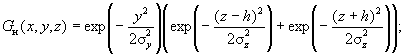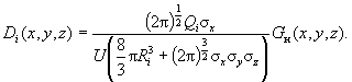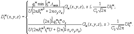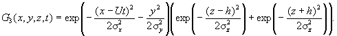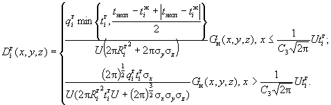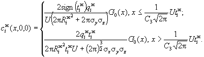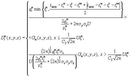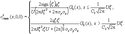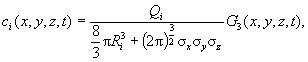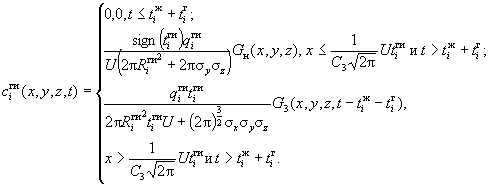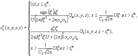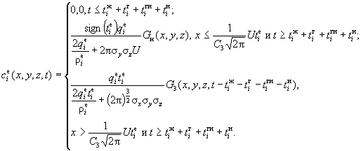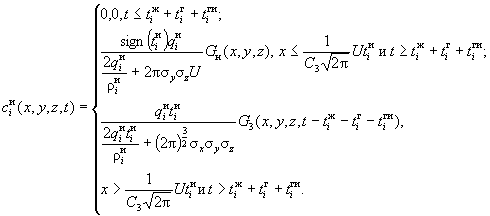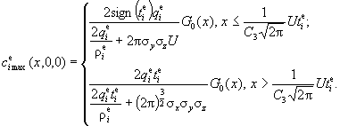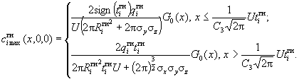 Максимальная концентрация при прохождении первичного облака наблюдается на оси y = 0, z = 0 в центре облака и рассчитывается по формуле
