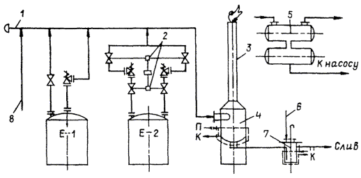 1 - подача продувочного (топливного) газа; 2 - факельный коллектор; 3 - источник сброса, наиболее удаленный от факельной установки; 4 - подача азота Приложение 4РАСЧЕТ КОНЦЕНТРАЦИЙ ГОРЮЧЕГО ГАЗА ПРИ СБРОСЕ ИЗ ПРЕДОХРАНИТЕЛЬНОГО КЛАПАНА ЧЕРЕЗ СБРОСНУЮ ТРУБУРасчет проведен для условий, когда выброс осуществляется горизонтально в течение длительного времени при наихудших метеоусловиях (штиль), а максимальная приземная концентрация газа не превышает 50 % нижнего предела распространения пламени (воспламенения). Для уменьшения приземной концентрации рекомендуется сбросной патрубок направлять вертикально вверх. 1. Величина приземной концентрации газа на различных расстояниях от предохранительного клапана определяется по формуле: С = 6 ´ М ´ d (VX)-1(r/rв)0,5 где М - количество сбрасываемого газа, г/с; d - диаметр сбросного патрубка, м; V - секундный объем сбрасываемого газа при нормальном давлении, м3/с; X - горизонтальное расстояние от сбросного патрубка до места, в котором определяется концентрация, м; r, rв - плотность сбрасываемого газа и окружающего воздуха, кг/м3; h - высота сбросного патрубка, м. 2. Величина максимальной приземной концентрации газа определяется по формуле: См = 0,35 ´ М ´ d (Vh)(r/rв), г/м3. 3. Расстояние, на котором наблюдается максимальная приземная концентрация, составляет: Хм = 10h, м. 4. Минимальная высота выброса определяется по формуле: hmin = 0,7 ´ М ´ d (VCнпв)-1(r/rв)0,5, м, где Снпв - концентрации нижнего предела распространения пламени, г/м3. Примечания: 1. Рекомендуется принимать скорость выхода газа из сбросного патрубка 80 м/с. 2. Опасной зоной считается круг радиусом Хм. Приложение 5СХЕМА ОСНАЩЕНИЯ НАСОСОВ ДЛЯ ОТКАЧКИ УГЛЕВОДОРОДОВ ТРУБОПРОВОДАМИ, КОНТРОЛЬНО-ИЗМЕРИТЕЛЬНЫМИ ПРИБОРАМИ И СРЕДСТВАМИ АВТОМАТИКИ