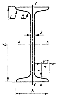 Постановлением Государственного комитета стандартов Совета Министров СССР от 17 января 1974 г. № 149 срок введения установлен с 01.01.75 Проверен в 1985 г. Постановлением Госстандарта от 27.06.85 № 2031 срок действия продлен до 01.07.95 1. Настоящий стандарт распространяется на горячекатаные двутавровые балки для подвесных путей (М), армировки шахтных стволов (С) и швеллеры для автомобильной промышленности (С). 1а. По точности прокатки профили изготовляют: высокой точности - А, обычной точности - В. (Введен дополнительно, Изм. № 2). 2. Форма, размеры балок и швеллеров, площадь поперечного сечения, масса 1 м и справочные величины должны соответствовать указанным на черт. 1 и 2 и табл. 1. Условные обозначения к черт. 1 и 2 и табл. 1: Черт. 1 Примечание. Уклон внутренних граней полок должен быть не более: для балок М-12 %, для балок С-16 %. Черт. 2 Примечание. Уклон внутренних граней полок дол жен быть не более 10 %. h - высота; b - ширина полки; s - толщина стенки; t - средняя толщина полки; R - радиус внутреннего закругления; r - радиус закругления полки; I - момент инерции; W - момент сопротивления; i - радиус инерции; S - статический момент полусечения; zo - расстояние от оси у-у до наружной грани стенки. Таблица 1