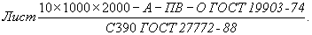 Прокат листовой размерами 10´1000´2000 мм, повышенной точности (А), высокой плоскостности (ПВ), с обрезной кромкой (О), из стали C390 по ГОСТ 27772-88.