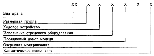 ходовое устройство: гусеничное ходовое устройство с минимально допустимой поверхностью гусениц - 1 гусеничное ходовое устройство с увеличенной поверхностью гусениц - 2 пневмоколесное ходовое устройство - 3 специальное шасси автомобильного типа - 4 шасси грузового автомобиля - 5 трактор - 6 прицепное ходовое устройство - 7 короткобазовое шасси - 8 резерв - 9 исполнение стрелового оборудования: с гибкой подвеской - 6 с жесткой подвеской - 7 резерв - 8; 9 порядковый номер модели: номера - 1; 2; 3; 4; 5; 6; 7; 8; 9 очередная модернизация: первая - А вторая - Б третья - В и т.д. климатическое исполнение: холодный климат - ХЛ тропики - Т тропики влажные - ТВ Пример условного обозначения. Кран стреловой самоходный общего назначения, 5-й размерной группы, на гусеничном ходовом устройстве с минимально допустимой поверхностью гусениц, с жесткой подвеской рабочего оборудования, второй модели, первой модернизации, в исполнении для тропиков: КС-5172АТ ГОСТ 22827-85 |