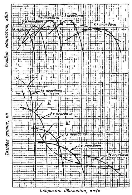 где N - число оборотов датчика пути (велосипедного колеса); п - число оборотов велосипедного колеса при свободном качении машины; d - путь при свободном качении, м; t - время прохождения испытательного участка, с (с точностью до 0,1 с); с - постоянный коэффициент, выражающий отношение пути к числу оборотов велосипедного колеса (c=d/n). 7.6.3. Тяговую мощность Р вычисляют по формуле P=vL, где L - тяговое усилие в килоньютонах, усредненное по времени или по пути. 8. ПРОТОКОЛ ИСПЫТАНИЙ8.1. Результаты испытаний определяют по форме табл. 2 и 3. 8.2. Тяговые характеристики следует строить по результатам серии испытательных заездов. Типовые примеры характеристик представлены на черт. 1. 8.3. Указанная в протоколе тяговая мощность - мощность, развиваемая в точке прицепа с учетом буксования колес. Необходимо приводить результаты измерения буксования колес. Таблица 2