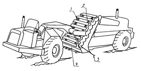 Срок действия с 01.01.88 до 01.01.93 1. НАЗНАЧЕНИЕ И ОБЛАСТЬ ПРИМЕНЕНИЯНастоящий стандарт устанавливает приближенный метод расчета объема типовых материалов, вмещаемых ковшом скрепера с элеваторной загрузкой, основанный на использовании данных о внутренних размерах ковша и условном объеме «шапки» ковша. Метод расчета используют для сравнения вместимостей ковшей. 2. ССЫЛКИСсылочные документы приведены в обязательном приложении. 3. ТЕРМИНЫ И ОПРЕДЕЛЕНИЯ3.2. Составные части скрепера с элеваторной загрузкой - составные части по черт. 1-3. 4. РАСЧЕТ ВМЕСТИМОСТИ4.1. Ковш располагают так, чтобы нижняя плоская поверхность ковша находилась в горизонтальном или близком к горизонтальному положении. 4.2. Положение механизма разгрузки ковша должно обеспечивать максимальную вместимость ковша. 4.3. Положение механизма элеваторной загрузки должно обеспечивать минимальное расстояние между ножом скрепера и траекторией наружных кромок скребков элеватора соответствовать документации изготовителя. 4.2. Границы геометрического объема ковша Границами геометрического объема ковша служат: а) внутренние поверхности боковых стенок; б) внутренняя поверхность задней части или механизма выдвижения задней стенки; в) днище; г) плоскость, перпендикулярная передней поверхности ножа и проходящая через ось натяжной звездочки элеватора (черт. 3); д) плоскость (или линейное продолжение) внутренней траектории скребков элеватора, ближайших к грузу в ковше (черт. 3); е) плоскость, определяемая средними линиями (черт. 3), проведенными горизонтально, чтобы площадь боковой стенки, находящаяся выше этих линий, была равна площади, расположенной ниже их; ж) вертикальные плоскости, соединяющие внутренние поверхности боковых стенок с плоскостью, определяемой средними линиями. 4.3. Границы объема «шапки» ковша Границами объема «шапки» ковша служат: а) верхняя горизонтальная поверхность геометрического объема (п. 4.2д) б) плоскость (или линейное продолжение плоскости) внутренней траектории скребков элеватора (п. 4.2д); и) плоскость, проведенная через верхнюю точку сплошной задней части ковша или механизма выдвижения задней стенки и касающаяся наружных кромок скребков элеватора (точка касания - верхний конец элеватора, черт. 4). Уклон плоскости не должен быть менее 3:1 (18,4°) в направлении вперед и вверх от верхней точки сплошной задней части ковша или механизма выдвижения задней стенки. Если уклон менее 3:1, то ограничивающая плоскость должна соответствовать требованиям п. 4.3 г; г) плоскость с уклоном 3:1 (в направлении назад и вниз), касательная к наружным кромкам скребков элеватора и доходящая до пересечения с задней частью ковша; д) плоскости с уклоном 1:1 (45°), направленные вверх и к середине ковша от средних линий (черт. 5). 4.4. Номинальная вместимость ковша Номинальная вместимость представляет собой сумму геометрического объема и объема «шапки» ковша. Выступы (косынки, опорные рычаги элеватора в ковше скрепера и т.д.) при расчете вместимости ковша не учитывают. 5. РЕЗУЛЬТАТЫ РАСЧЕТА5.1. Значения номинальной вместимости ковша не должны отличаться более чем на ±3% вместимости, определяемой по данному методу. 5.2. Значения номинальной вместимости ковша менее 10 м3 следует указывать с точностью до 0,1 м3, более 10 м3 - с точностью до 0,5 м3. Скрепер с элеваторной загрузкой 1 - цепи; 2 - скребки: 3 - элеватор; 4 - н
