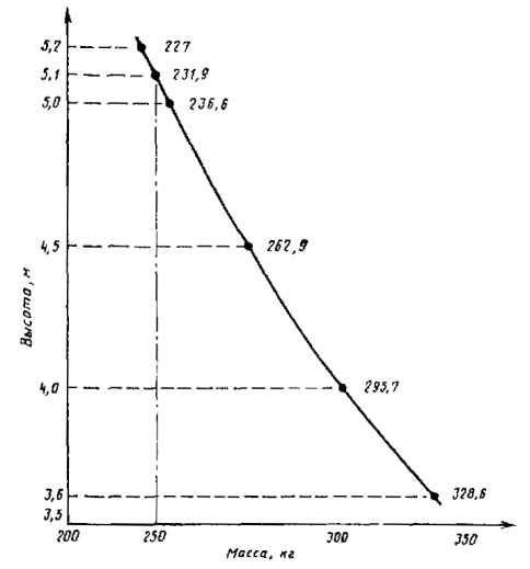 1 - узкий конец предмета; 2 - вертикальная проекция DLV; 3 - основной верхний горизонтальный элемент Черт. 2 Случай 2 Основные верхние горизонтальные элементы FOPS пересекают вертикальную проекцию DLV на верхнюю часть FOPS. Если материал покрытия всех площадей поверхности над DLV одинаковой толщины, то центр предмета должен быть на поверхности наибольшей площади. Данная площадь является площадью проекции DLV без учета площади основных верхних горизонтальных элементов. Центр предмета должен быть в точке, находящейся в пределах поверхности наибольшей площади, имеющей максимально возможную сумму перпендикулярных расстояний (А и В на черт. 2), измеряемых от основных верхних горизонтальных элементов конструкции. Если используют другие материалы или материалы неодинаковой толщины для различных площадей поверхности DLV, то испытаниям следует подвергать каждую площадь поверхности поочередно. 6.3.3. Предмет следует поднимать вертикально на высоту, измеряемую от положения, указанного в пп. 6.3.1 и 6.3.2, чтобы развить энергию 11600 Дж, определяемую в зависимости от массы предмета (см. черт. 1). Для получения максимальной деформации удар испытательным предметом должен быть направленным. Примечание. Для развития энергии 11600 Дж предмет следует поднимать на высоту 3,6-5,2 м. Высота зависит от массы предмета (черт. 3). График зависимости высоты от массы падающего предмета, развивающего энергию 11 600 Дж Черт. 3 6.3.4. Предмет следует сбрасывать так, чтобы он свободно падал на FOPS. 6.3.5. При свободном падении попадание предмета в точку, указанную в пп. 6.3.1 и 6.3.2, маловероятно, поэтому возможны следующие допущения. 6.3.5.1. Первый удар узким концом предмета должен быть направлен в круг радиусом 200 мм, но не должен попадать на основные верхние горизонтальные элементы конструкции (центр данного круга должен совпадать с вертикальной осевой линией предмета, расположенного в соответствии с требованиями пп. 6.3.1 и 6.3.2). 6.3.5.2. Начальный контакт предмета с FOPS следует осуществлять узким концом предмета или его закругленной частью (см. черт. 1). 6.3.5.3. Ограничения по следующим рикошетным ударам отсутствуют. 7. ТЕХНИЧЕСКИЕ ТРЕБОВАНИЯ7.1. Защитные свойства FOPS следует оценивать способностью кабины или защитной конструкции противостоять удару. При первом и последующих ударах предметом ни один из элементов устройства защиты от падающих предметов не должен проникать в DLV (ГОСТ 27245-87). Если испытательный предмет проникает через FOPS, то конструкция испытаний не выдержала. 7.2. Если используют единую конструкцию ROPS и FOPS, то конструкция FOPS должна также отвечать техническим требованиям, предъявляемым к ROPS (см. ГОСТ 27714-88). Если конструкция не предназначена для использования в качестве ROPS, то для опоры FOPS допускается использовать другую конструкцию при условии, что при испытаниях не будет нарушен DLV. FOPS должно полностью покрывать и перекрывать вертикальную проекцию DLV. Примечания: 1. При использовании одной и той же конструкции для оценки устройства защиты при опрокидывании и устройства защиты от падающих предметов, испытания ROPS должны предшествовать испытаниям FOPS. Допускается устранять дефекты или заменять вышедшие из строя элементы FOPS. 2. Необязательно, чтобы DLV полностью находился в пространстве, ограниченном ROPS или FOPS, имеющем четыре или более вертикальных элементов. Допускается использовать простую дв