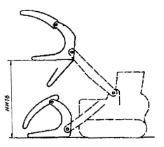 стрела; 5 - стреловой цилиндр; Примечание. В соответствующих случаях наименования позиции 7, 8, 9 и 10 могут дополняться определениями «передний» или «задний». 6. РАБОЧЕЕ И ДОПОЛНИТЕЛЬНОЕ ОБОРУДОВАНИЕ6.1. Определения 6.1.1. Обратная лопата - механизм, навешиваемый на заднюю часть погрузчика, который обычно копает материал ниже уровня стоянки, поднимает, перемещает с поворотом и выгружает материал, действуя стрелой, рукоятью и ковшом. Копание осуществляется движением ковша в направлении к машине. Обратная лопата поворачивается в плане на угол менее 360° (см. черт. 17). 6.1.2. Рыхлитель - механизм с зубьями для внедрения и рыхления на малую глубину грунта, асфальтовых, гравийных и других дорожных покрытий. Рыхлитель обычно навешивают сзади погрузчика, но он может быть установлен и на задней стороне ковша (см. черт. 18). 6.1.3. Ковш с боковой разгрузкой - ковш, который заполняется при движении машины вперед и может выгружать материал через какую-либо боковую сторону ковша. Он может также выгружать материал вперед (см. черт. 19). 6.1.4. Двухчелюстной ковш - ковш, задняя челюсть которого выполнена в виде бульдозерного отвала с шарнирами в верхней части для крепления передней челюсти, которую можно устанавливать в разные положения, позволяющие использовать оборудование в качестве бульдозера, скрепера, грейфера или погрузочного ковша (см. черт. 20). 6.1.5. Грузовые вилы - конструкция с вилками для подъема, транспортирования и разгрузки складских поддонов (см. черт. 21). 6.1.6. Челюстной захват - механизм с вилками и верхним прижимом для подъема, транспортирования и разгрузки бревен (см. черт. 22). 6.1.7. Лебедка - механизм с барабаном, смонтированный на задней части рамы машины (см. черт. 23). 6.1.8. Основной ковш - ковш для работы с материалами с объемной массой 1,6-1,8 т/м3. (Введен дополнительно, Изм. № 1). 6.1.9. Увеличенный (уменьшенный) ковш - ковш для работы с легкими (тяжелыми) материалами. (Введен дополнительно, Изм. № 1). 6.1.10. Скелетный ковш - ковш для выборочного захвата крупнокусковых материалов. (Введен дополнительно, Изм. № 1). 6.1.11. Ковш с принудительной разгрузкой - ковш, опорожнение которого осуществляется подвижной частью с силовым приводом. (Введен дополнительно, Изм. № 1). 6.1.12. Крановая безблочная стрела - рабочий орган для подъема и транспортирования штучных грузов на крюковой подвеске. (Введен дополнительно, Изм. № 1). 6.1.13. Позиционер ковша - устройство для автоматической остановки ковша погрузчика в предварительно заданное положение. (Введен дополнительно, Изм. № 1). 6.1.14. Конечный останов ковша - устройство для автоматической остановки ковша на предварительно заданной высоте. (Введен дополнительно, Изм. № 1). Черт. 17. Размеры обратной лопаты 6.2. Размерные характеристики 6.2.1. Определения размерных характеристик - по ИСО 6746/2. 6.2.2. Определения размерных характеристик, относящихся только к рабочему и дополнительному оборудованию погрузчиков, приведены в приложении В. Черт. 18. Размеры рыхлителя Черт. 19. Размеры ковша с боковой разгрузкой Черт. 20. Размеры двухчелюстного ковша Черт. 21. Размеры грузовых вил Черт. 22. Размеры челюстного захвата Черт. 23. Размеры лебедки 6.3. Наименования составных частей (см. номера позиций на схеме) 6.3.1. Ковш с боковой разгрузкой