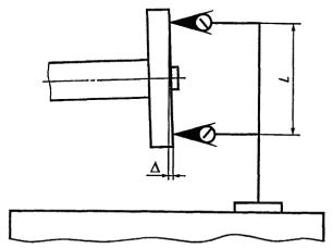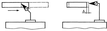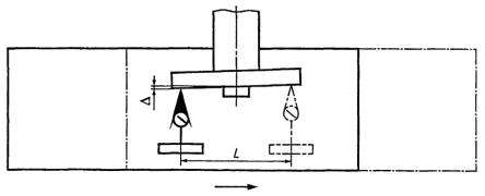где L - длина двойного хода пильной рамы, м (измеряется штриховыми мерами длины); п - число двойных ходов пильной рамы за время t; t - время, с (определяется секундомером любого типа и класса). 4.4 Среднюю скорость дисковых станков v, м/с, по 3.3 рассчитывают по формуле v = pDn, (2) где D - диаметр отрезного круга, м; n - частота вращения отрезного круга, с-1 (измеряется тахометром с пределом измерения от 3,3 до 16,6 с-1 (от 200 до 1000 об/мин), класса точности II по ГОСТ 21339). 4.5 Скорость подачи по 3.3 измеряют штриховыми мерами длины и секундомером любого типа и класса. 4.6 Радиальное биение по 3.4 определяют индикатором с диапазоном измерения от 0 до 2 мм, класса точности I по ГОСТ 577, установленным на штативе с магнитным основанием по ГОСТ 10197, который располагают на рабочей поверхности стола. 4.7 Контроль параллельности оси шпинделя относительно рабочей поверхности стола по 3.5 проводят: - на однодисковых станках - по центровой оправке по ГОСТ 8 или по опорной поверхности шпинделя под режущий инструмент на заданной длине L двумя индикаторами с диапазоном измерения от 0 до 2 мм, класса точности I по ГОСТ 577, установленными на штативе с магнитным основанием по ГОСТ 10197 в соответствии с рисунком 1. Отклонение от параллельности определяют по разности показаний индикаторов (D), предварительно установленных на «0»; - на многодисковых станках - двумя индикаторами, установленными на рабочей поверхности стола на заданной длине L в соответствии с рисунком 2. Отклонение от параллельности определяют по разности показаний индикаторов D, предварительно установленных на «0». 4.8 Контроль перпендикулярности оси шпинделя относительно направления перемещения стола по 3.6 проводят по центровой оправке по ГОСТ 8 или по опорной поверхности шпинделя под режущий инструмент индикатором с диапазоном измерения от 0 до 2 мм, класса точности I по ГОСТ 577, установленным на штативе с магнитным основанием по ГОСТ 10197 в соответствии с рисунком 3. Отклонение от перпендикулярности определяют по разности показаний индикатора (D) при продольном перемещении стола на заданную длину L. Рисунок 1 Рисунок 2 Рисунок 3 Рисунок 4 4.9 Контроль прямолинейности перемещения пильной рамы в горизонтальной плоскости по 3.7 проводят индикатором с диапазоном измерения от 0 до 2 мм, класса точности I по ГОСТ 577, установленным на штативе с магнитным основанием по ГОСТ 10197 в соответствии с рисунком 4. Отклонение от прямолинейности определяют по разности показаний D в начальном и конечном положениях пильной рамы при ее продольном перемещении. 4.10 Контроль перпендикулярности перемещения пильной рамы в вертикальной плоскости относительно рабочей поверхности стола по 3.8 проводят двумя индикаторами с диапазоном измерения от 0 до 2 мм, класса точности I по ГОСТ 577, установленными на одном штативе с магнитным основанием по ГОСТ 10197 в соответствии с рисунком 5. Рисунок 5 Индикаторы предварительно выставляют на «0», пильную раму перемещают в вертикальной плоскости на заданную длину L. Отклонение от перпендикулярности D определяют по разности показаний индикаторов. 4.11 Отклонение от параллельности полосовых пил по 3.9 определяют по разности размеров между натянутыми до рабочего состояния пилами у противоположных мест их крепления, измеренных штангенциркулем с диапазоном измерения от 0 до 250 мм, отсчетом по нониусу 0,1 мм, класса точности I по ГОСТ 166. 