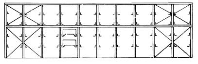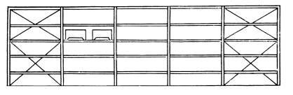 4. Грузонесущим элементом стеллажей типа 2 являются консольные элементы, присоединенные к ветвям стоек. Эти элементы обычно конструируются, в виде уголков, выполняющих одновременно роль планок стержневой решетки стойки, но могут быть и в виде коротких элементов. Продольные связи, соединяющие стойки, устанавливаются в передней и задней плоскостях, причем поверху - обязательно.