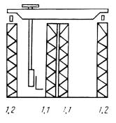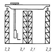 1. Схемы фронтальных проекций стеллажей представлены на черт. 1, схемы поперечных разрезов складов, оборудованных стеллажами и кранами-штабелерами, даны на черт. 2.