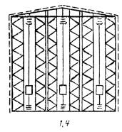 8. Исполнения 1.4; 2.4; 3.4 аналогичны по конструкции описанным в п. 7, но дополнительно имеют стропильные и стеновые элементы для установки ограждающих конструкций стен и крыши. Во избежание появления дополнительных нагрузок на стеллажи и стропила, вызванных неравномерной просадкой фундаментов, следует принимать конструктивные мероприятия по моментной развязке стропильных конструкций и стеллажных блоков.