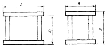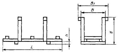 Пример условного обозначения металлической тары типа 2, исполнения 3 с L = 1200 мм, В = 800 мм, H = 850 мм, массой брутто 2,00 т: Тара 2 - 3 - 120 - 80 - 85 - 2,00М ГОСТ 14861-91 То же, для комбинированной тары: Тара 2 - 3 - 120 - 80 - 85 - 2,00К ГОСТ 14861-91 6. Основные параметры и размеры тары типа 3, исполнения 1 должны соответствовать указанным на черт. 4 и в табл. 5. Черт. 4 Таблица 5 Размеры, мм