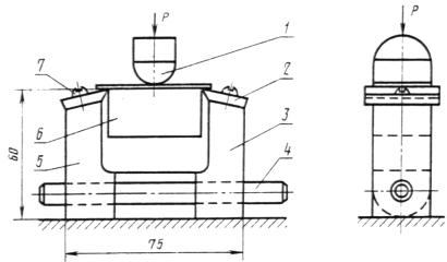 каждый образец нумеруют. Ширину образца b у торцов основания и толщину облицовочного материала 2. АППАРАТУРА2.1. Для проведения испытания должны применяться следующие аппаратура и приборы: испытательная машина, оснащенная реверсом, с погрешностью измерения нагрузки не более 2 Н (0,2 кгс); 1 - пуансон; 2 - нож; 3 - самоустанавливающаяся опора с цилиндрическим основанием; 4 - стержень; 5 - опора с плоским основанием; 6 - образец; 7 - винт М5 Черт. 3 приспособление для испытания (черт. 3). Опорные кромки ножей приспособления должны быть расположены в горизонтальной плоскости параллельно друг другу. Допускаемое отклонение: кромок ножей от горизонтальной плоскости 0,1/1000 мм; на непараллельность - 0,1 мм по длине ножей; штангенциркуль по ГОСТ 166-80, с погрешностью измерения не более 0,1 мм; микрометр по ГОСТ 6507-78. (Измененная редакция, Изм. № 1). 3. ПРОВЕДЕНИЕ ИСПЫТАНИЯ3.1. Образец устанавливают на опоры приспособления. Пуансон центрируют по линии действия нагрузки (черт. 3), совпадающей с линией, отмеченной на образце. 3.2. Образец нагружают с постоянной скоростью перемещения подвижного захвата машины, равной (0,4 - 0,5)·10-3 м/с (24 - 30) мм/мин. 3.3. По шкале машины определяют разрушающую нагрузку Р в начальный момент отрыва облицовочного материала. 4. ОБРАБОТКА РЕЗУЛЬТАТОВ4.1. Прочность клеевого соединения при испытании на неравномерный отрыв (q) вычисляют с погрешностью не более 0,1 кН/м (0,1 кгс/см) по формуле