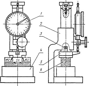 Постановлением Государственного комитета стандартов Совета Министров СССР от 9 декабря 1970 г. № 1723 срок введения установлен с 01.01.71 Постановлением Госстандарта от 30.05.83 № 2393 срок действия продлен до 01.01.89 Несоблюдение стандарта преследуется по закону Настоящий стандарт распространяется на древесину и устанавливает метод определения условного предела прочности при местном смятии поперек волокон в радиальном и тангентальном направлениях. (Измененная редакция, Изм. №1, 3). 1 - индикатор; 2 - корпус; 3 - шток; 4 - подставка; 5 - съемный пуансон; 6 - образец Черт. 1 1. АППАРАТУРА И МАТЕРИАЛЫ1.1. Для определения предела прочности при испытании на местное смятие поперек волокон, должны применяться следующие аппаратура и материалы: испытательная машина по ГОСТ 7855-74 с погрешностью измерения нагрузки не более 1 %; штангенциркуль по ГОСТ 166-80 с погрешностью измерения не более 0,1 мм; приспособление к испытательной машине со съемным пуансоном и индикатором часового типа по ГОСТ 577-68 с погрешностью измерения не более 0,01 мм (черт. 1); аппаратура и материалы для определения влажности древесины по ГОСТ 16483.7-71. 2. ПОДГОТОВКА К ИСПЫТАНИЮ2.1. Образцы изготовляют в форме прямоугольной призмы с основанием 20´20 мм и длиной вдоль волокон 60 мм. Если годичные слои имеют ширину более 4 мм, размеры поперечного сечения должны быть увеличены так, чтобы образец включал не менее 5 слоев. (Измененная редакция, Изм. № 1, 2). 2.2. Точность изготовления, влажность и количество образцов для каждого направления приложения нагрузки должны соответствовать ГОСТ 16483.0-78. 3. ПРОВЕДЕНИЕ ИСПЫТАНИЯ3.1. На середине длины образца измеряют с погрешностью не более 0,1 мм ширину образца b в тангентальном направлении при радиальном смятии или в радиальном направлении при тангентальном смятии. 3.2. Образец помещают в машину тангентальной или радиальной поверхностью кверху и нагружают через пуансон в соответствии с черт. 1. Постоянная скорость нагружения или постоянная скорость перемещения нагружающей головки машины должна быть такой, чтобы условный предел прочности был достигнут через (1,5±0,5) мин после начала нагружения. При использовании машины с электромеханическим приводом допускается проводить испытания с равномерной скоростью нагружения (1000±200) Н/мин при условии достижения в указанный интервал времени нагрузки, соответствующей условному пределу прочности образца при местном смятии поперек волокон. (Измененная редакция, Изм. № 2, 3). 3.3. Через каждые 200 Н для мягких пород и через 400 Н для твердых пород измеряют с погрешностью не более 0,01 мм деформацию образца. Испытание продолжают до превышения условного предела прочности, что характеризуется резким увеличением деформации. 3.4. После испытаний определяют влажность образцов в соответствии с ГОСТ 16483.7-71. В качестве пробы на влажность берут среднюю часть образца длиной 30 мм с отпечатком пуансона. Для определения средней влажности партии образцов допускается отбирать каждый пятый образец, но не менее 3. 4. ПОДСЧЕТ РЕЗУЛЬТАТОВ ИСПЫТАНИЙ4.1. Для определения нагрузки по результатам измерений вычерчивают диаграмму смятия поперек волокон, подобную изображенной на черт. 2. За нагрузку Р принимают ординату точки перехода прямолинейного или близкого к прямолинейному участка диаграммы в явно криволинейный. Масштаб диаграммы по оси ординат должен быть не менее 5