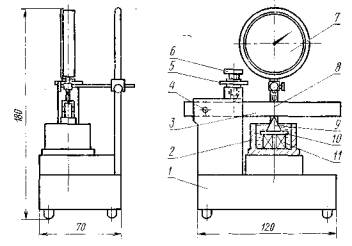* Переиздание (июнь 1985 г.) с Изменением № 1, утвержденным в июне 1984 г. (ИУС 9-84) Постановлением Государственного комитета стандартов Совета Министров СССР от 21 декабря 1972 г. № 2300 срок введения установлен с 01.07.74 Постановлением Госстандарта от 21.06.84 № 2006 срок действия продлен до 01.01.90 Несоблюдение стандарта преследуется по закону Настоящий стандарт распространяется на древесину и устанавливает методы определения давления набухания при стесненном разбухании и линейного разбухания в радиальном и тангентальном направлениях, а также их зависимость от времени выдержки древесины в воде. 1. АППАРАТУРА И МАТЕРИАЛЫПрибор, обеспечивающий измерение давления набухания с погрешностью не более 1·104 Па и линейного разбухания с погрешностью не более 0,01 мм (черт. 1).