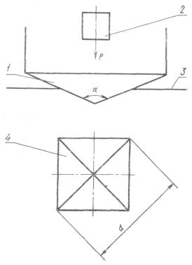 где Р - нагрузка, даН; F - условная площадь боковой поверхности отпечатка, мм2. Условная площадь боковой поверхности отпечатка (F) для стандартной четырехгранной пирамиды с углом при вершине между противоположными гранями 136° равна: