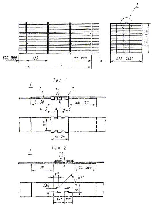 Постановлением Государственного комитета стандартов Совета Министров СССР от 4 ноября 1975 г. № 2775 срок действия установлен с 01.01. 77 до 01.01. 82 Несоблюдение стандарта преследуется по закону Настоящий стандарт распространяется на обвязки разового пользования из стальной упаковочной лепты, предназначенные для сохранения формы и конструкции транспортных пакетов прямоугольного сечения, сформированных по ГОСТ 16369-70 и ГОСТ 19041-73. 1. ТИПЫ И РАЗМЕРЫ1.1. В зависимости от вида соединения концов ленты устанавливаются два типа обвязок: 1 - с пломбовым соединением; 2 - с беспломбовым соединением. 1.2. Основные размеры узлов соединения должны соответствовать указанным на чертеже. Пример условного обозначения: Обвязки с пломбовым соединением из ленты толщиной 0,5 мм: Обвязка 1-0,5 ГОСТ 21214-75 то же, с беспломбовым соединением из ленты толщиной 0,7 мм: Обвязка 2-0,7 ГОСТ 21214-75