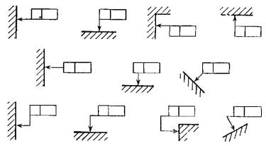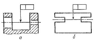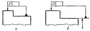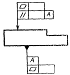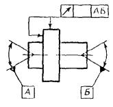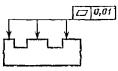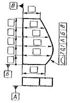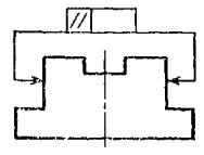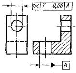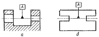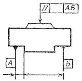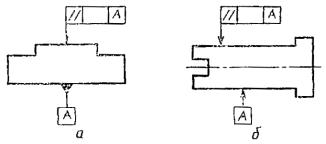 значения допуска указывают символ Контур выступающей части нормируемого элемента ограничивают тонкой сплошной линией, а длину и расположение выступающего поля допуска - размерами (черт. 15). Черт. 15 2.13. Надписи, дополняющие данные, приведенные в рамке допуска, следует наносить над рамкой под ней или как показано на черт. 16. Черт. 16 (Измененная редакция, Изм. № 1). 2.14. Если для одного элемента необходимо задать два разных вида допуска, то допускается рамки объединять и располагать их согласно черт. 17 (верхнее обозначение). Если для поверхности требуется указать одновременно условное обозначение допуска формы или расположения и ее буквенное обозначение, используемое для нормирования другого допуска, то рамки с обоими условными обозначениями допускается располагать рядом на соединительной линии (черт. 17, нижнее обозначение). 2.15. Повторяющиеся одинаковые или разные виды допусков, обозначаемые одним и тем же знаком, имеющие одинаковые числовые значения и относящиеся к одним и тем же базам, допускается указывать один раз в рамке, от которой отходит одна соединительная линия, разветвляемая затем ко всем нормируемым элементам (черт. 18). Черт. 17 Черт. 18 2.16. Допуски формы и расположения симметрично расположенных элементов на симметричных деталях указывают один раз. 3. ОБОЗНАЧЕНИЕ БАЗ3.1. Базы обозначают зачерненным треугольником, который соединяют при помощи соединительной линии с рамкой. При выполнении чертежей с помощью выводных устройств ЭВМ допускается треугольник, обозначающий базу, не зачернять. Треугольник, обозначающий базу, должен быть равносторонним, высотой приблизительно равной размеру шрифта размерных чисел. 3.2. Если базой является поверхность или ее профиль, то основание треугольника располагают на контурной линии поверхности (черт. 19а) или на ее продолжении (черт. 19б). При этом соединительная линия не должна быть продолжением размерной линии. Черт. 19 3.3. Если базой является ось или плоскость симметрии, то треугольник располагают на конце размерной линии (черт. 18). В случае недостатка места стрелку размерной линии допускается заменять треугольником, обозначающим базу (черт. 20). Черт. 20 Если базой является общая ось (черт. 21а) или плоскость симметрии (черт. 21б) и из чертежа ясно, для каких поверхностей ось (плоскость симметрии) является общей, то треугольник располагают на оси. Черт. 21 (Измененная редакция, Изм. № 1). 3.4. Если базой является ось центровых отверстий, то рядом с обозначением базовой оси делают надпись «Ось центров» (черт. 22). Допускается обозначать базовую ось центровых отверстий в соответствии с черт. 23. Черт. 22 Черт. 23 3.5. Если базой является определенная часть элемента, то ее обозначают штрихпунктирной линией и ограничивают размерами в соответствии с черт. 24. Если базой является определенное место элемента, то оно должно быть определено размерами согласно черт. 25. Черт. 24 Черт. 25 3.6. Если нет необходимости выделять как базу пи одну из поверхностей, то треугольник заменяют стрелкой (черт. 26б). 3.7. Если соединение рамки с базой или другой поверхностью, к которой относится отклонение расположения, затруднительно, по поверхность обозначают прописной буквой, вписываемой в третью часть рамки. Эту же букву вписывают в рамку, которую соединяют с обозначаемой поверхностью линией, закапчивающейся треугольником, если обозначают 
