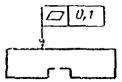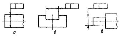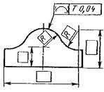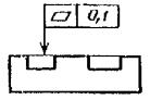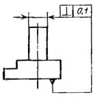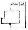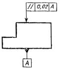 1.2. Допуск формы и расположения поверхностей допускается указывать текстом в технических требованиях, как правило, в том случае, если отсутствует знак вида допуска. 1.3. При указании допуска формы и расположения поверхностей в технических требованиях текст должен содержать: вид допуска; указание поверхности или другого элемента, для которого задается допуск (для этого используют буквенное обозначение или конструктивное наименование, определяющее поверхность); числовое значение допуска в миллиметрах; указание баз, относительно которых задается допуск (для допусков расположения и суммарных допусков формы и расположения); указание о зависимых допусках формы или расположения (в соответствующих случаях). 1.4. При необходимости нормирования допусков формы и расположения, не указанных на чертеже числовыми значениями и не ограничиваемых другими указанными в чертеже допусками формы и расположения, в технических требованиях чертежа должна быть приведена общая запись о неуказанных допусках формы и расположения со ссылкой на ГОСТ 25069-81 или другие документы, устанавливающие неуказанные допуски формы и расположения. Например: 1. Неуказанные допуски формы и расположения - по ГОСТ 25069-81. 2. Неуказанные допуски соосности и симметричности - по ГОСТ 25069-81. (Введен дополнительно, Изм. № 1). 2. НАНЕСЕНИЕ ОБОЗНАЧЕНИЙ ДОПУСКОВ2.1. При условном обозначении данные о допусках формы и расположения поверхностей указывают в прямоугольной рамке, разделенной на две и более части (черт. 1, 2), в которых помещают: в первой - знак допуска по таблице; во второй - числовое значение допуска в миллиметрах; в третьей и последующих - буквенное обозначение базы (баз) или буквенное обозначение поверхности, с которой связан допуск расположения (пп. 3.7; 3.9). Черт. 1 Черт. 2 2.2. Рамки следует выполнять сплошными тонкими линиями. Высота цифр, букв и знаков, вписываемых в рамки, должна быть равна размеру шрифта размерных чисел. Графическое изображение рамки приведено в обязательном приложении 1. 2.3. Рамку располагают горизонтально. В необходимых случаях допускается вертикальное расположение рамки. Не допускается пересекать рамку какими-либо линиями. 2.4. Рамку соединяют с элементом, к которому относится допуск, сплошной тонкой линией, заканчивающейся стрелкой (черт. 3). Черт. 3 Соединительная линия может быть прямой или ломаной, но направление отрезка соединительной линии, заканчивающегося стрелкой, должно соответствовать направлению измерения отклонения. Соединительную линию отводят от рамки, как показано на черт. 4. Черт. 4 В необходимых случаях допускается: проводить соединительную линию от второй (последней) части рамки (черт. 5а); заканчивать соединительную линию стрелкой и со стороны материала детали (черт. 5б). Черт. 5 2.5. Если допуск относится к поверхности или ее профилю, то рамку соединяют с контурной линией поверхности или ее продолжением, при этом соединительная линия не должна быть продолжением размерной линии (черт. 6, 7). Черт. 6 Черт. 7 2.6. Если допуск относится к оси или плоскости симметрии, то соединительная линия должна быть продолжением размерной линии (черт. 8а, б). При недостатке места стрелку размерной линии допускается совмещать со стрелкой соединительной линии (черт. 8в). Черт. 8 Если размер элемента уже указан один раз, то на других размерных линиях данного элемента, исп