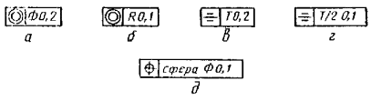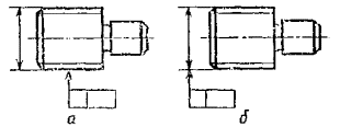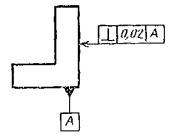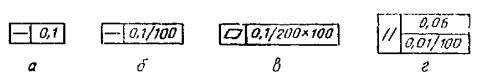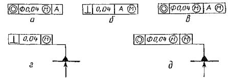 допуски формы и расположения обозначают условным знаком после числового значения допуска, если зависимый допуск связан с действительными размерами рассматриваемого элемента (черт. 32а); после буквенного обозначения базы (черт. 32б) или без буквенного обозначения в третьей части рамки (черт. 32г), если зависимый допуск связан с действительными размерами базового элемента; после числового значения допуска и буквенного обозначения базы (черт. 32в) или без буквенного обозначения (черт. 32д), если зависимый допуск связан с действительными размерами рассматриваемого и базового элементов. 5.2. Если допуск расположения или формы не указан как зависимый, то его считают независимым. Черт. 32 ПРИЛОЖЕНИЕ 2