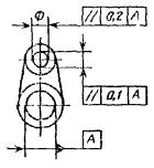 Допуск параллельности осей отверстий в общей плоскости 0,1 мм. Допуск перекоса осей отверстий 0,2 мм. База - ось отверстия А. |
