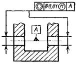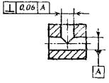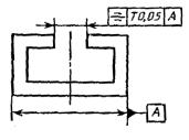 Допуск симметричности паза Т 0,05 мм. База - плоскость симметрии поверхностей А |