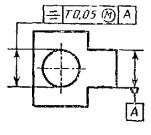 Допуск симметричности отверстия Т 0,05 мм (допуск зависимый). База - плоскость симметрии поверхности А. |