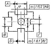 Допуск симметричности осп отверстия относительно общей плоскости симметрии пазов АБ Т 0,2 мм и относительно общей плоскости симметрии пазов ВГ Т 0,1 мм. |