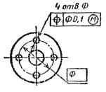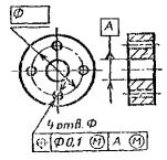 Позиционный допуск осей 4-х отверстий Æ 0,1 мм (допуск зависимый). База - ось отверстия А (допуск зависимый). |