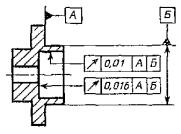Допуск радиального биения отверстия 0,01 мм Первая база - поверхность Л. Вторая база - ось поверхности В. Допуск торцового биения относительно тех же баз 0,016 мм. |