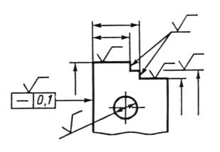 Черт. 6 (Измененная редакция. Изм. № 3). 2. ПРАВИЛА НАНЕСЕНИЯ ОБОЗНАЧЕНИЙ ШЕРОХОВАТОСТИ ПОВЕРХНОСТЕЙ НА ЧЕРТЕЖАХ2.1. Обозначения шероховатости поверхностей на изображении изделия располагают на линиях контура, выносных линиях (по возможности ближе к размерной линии) или на полках линий-выносок. Допускается при недостатке места располагать обозначения шероховатости на размерных линиях или на их продолжениях, на рамке допуска формы, а также разрывать выносную линию (черт. 7).