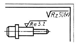 Черт. 7 (Измененная редакция, Изм. № 3). 2.2. На линии невидимого контура допускается наносить обозначение шероховатости только в случаях, когда от этой линии нанесен размер. 2.3. Обозначения шероховатости поверхности, в которых знак имеет полку, располагают относительно основной надписи чертежа так, как показано на черт. 8 и 9. 2.4. Обозначения шероховатости поверхности, в которых знак не имеет полки, располагают относительно основной надписи чертежа так, как показано на черт. 10. 2.5. При изображении изделия с разрывом обозначение шероховатости наносят только на одной части изображения, по возможности ближе к. месту указания размеров (черт. 11). Черт. 8 Черт. 9