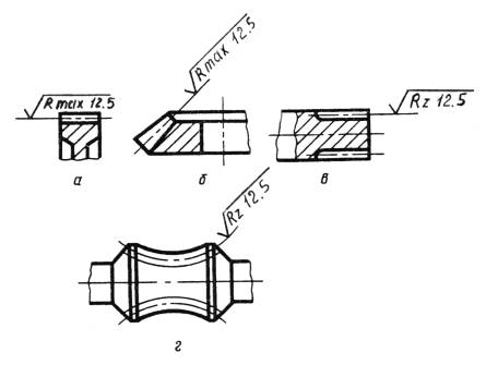 Черт. 15 (Измененная редакция. Изм. № 3). 2.10. Обозначение шероховатости рабочих поверхностей зубьев зубчатых колес, эвольвентных шлицев и т. п., если на чертеже не приведен их профиль, условно наносят на линии делительной поверхности (черт. 16а, б, в), а для глобоидных червяков и сопряженных с ними колес - на линии расчетной окружности (черт. 16г).