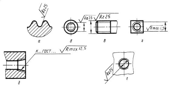 Черт. 16 (Измененная редакция. Изм. № 3). 2.11. Обозначение шероховатости поверхности профиля резьбы наносят по общим правилам при изображении профиля (черт. 17а) или условно на выносной линии для указания размера резьбы (черт. 17б, в, г, д), на размерной линии или на ее продолжении (черт. 17е).