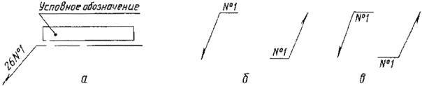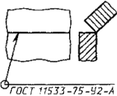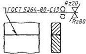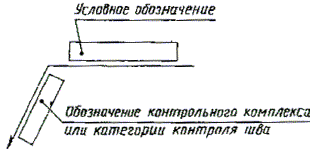 Примечания: 1. За лицевую сторону одностороннего шва сварного соединения принимают сторону, с которой производят сварку. 2. За лицевую сторону двустороннего шва сварного соединения с несимметрично подготовленными кромками принимают сторону, с которой производят сварку основного шва. 3. За лицевую сторону двустороннего шва сварного соединения с симметрично подготовленными кромками может быть принята любая сторона. В условном обозначении шва вспомогательные знаки выполняют сплошными тонкими линиями. Вспомогательные знаки должны быть одинаковой высоты с цифрами, входящими в обозначение шва. 2.2. Структура условного обозначения стандартного шва или одиночной сварной точки приведена на схеме (черт. 5). Черт. 5 Знак 2.3. Структура условного обозначения нестандартного шва или одиночной сварной точки приведена на схеме (черт. 6). Черт. 6 В технических требованиях чертежа или таблицы швов указывают способ сварки, которым должен быть выполнен нестандартный шов. 2.4. Условное обозначение шва наносят: а) на полке линии-выноски, проведенной от изображения шва с лицевой стороны (черт. 7а); б) под полкой линии-выноски, проведенной от изображения шва с оборотной стороны (черт. 7б). Черт. 7 2.5. Обозначение шероховатости механически обработанной поверхности шва наносят на полке или под полкой линии-выноски после условного обозначения шва (черт. 8), или указывают в таблице швов, или приводят в технических требованиях чертежа, например: «Параметр шероховатости поверхности сварных швов...» Примечание. Содержание и размеры граф таблицы швов настоящим стандартом не регламентируются. Черт. 8 2.6. Если для шва сварного соединения установлен контрольный комплекс или категория контроля шва, то их обозначение допускается помещать под линией-выноской (черт. 9). Черт. 9 В технических требованиях или таблице швов на чертеже приводят ссылку на соответствующий нормативно-технический документ. 2.7. Сварочные материалы указывают на чертеже в технических требованиях или таблице швов. Допускается сварочные материалы не указывать. 2.8. При наличии на чертеже одинаковых швов обозначение наносят у одного из изображений, а от изображений остальных одинаковых швов проводят линии-выноски с полками. Всем одинаковым швам присваивают один порядковый номер, который наносят: а) на линии-выноске, имеющей полку с нанесенным обозначением шва (черт. 10 а); б) на полке линии-выноски, проведенной от изображения шва, не имеющего обозначения, с лицевой стороны (черт. 10 б); в) под полкой линии-выноски, проведенной от изображения шва, не имеющего обозначения, с оборотной стороны (черт. 10 в). Количество одинаковых швов допускается указывать на линии-выноске, имеющей полку с нанесенным обозначением (см. черт. 10 а). Черт. 10 Примечание. Швы считают одинаковыми, если: одинаковы их типы и размеры конструктивных элементов в поперечном сечении; к ним предъявляют одни и те же технические требования. 2.9. Примеры условных обозначений швов сварных соединений приведены в приложениях 1 и 2. 3. УПРОЩЕНИЯ ОБОЗНАЧЕНИЙ ШВОВ СВАРНЫХ СОЕДИНЕНИЙ 3.1. При наличии на чертеже швов, выполняемых по одному и тому же стандарту, обозначение стандарта указывают в технических требованиях чертежа (запись по типу: «Сварные швы... по...») или таблице. 3.2. Допускается не присваивать порядковый номер одинаковым швам, если все швы на чертеже 