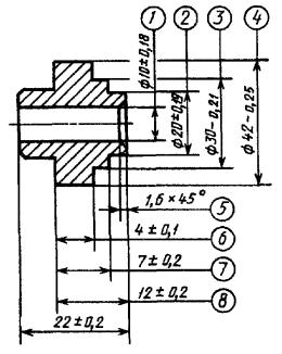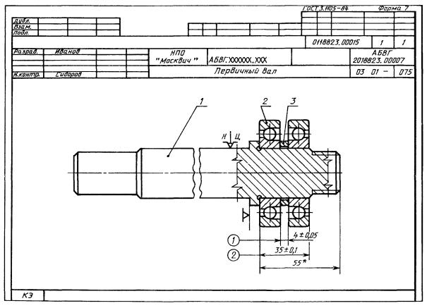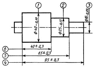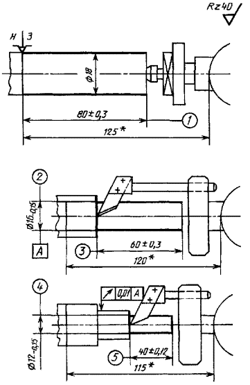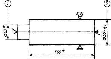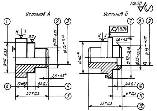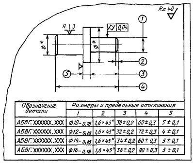 на которые не нанесены обозначение шероховатости или знак 4.3.7.4 При применении сечений, разрезов на одном эскизе или применении эскиза (эскизов) на группу операций обозначение шероховатости для одних и тех же поверхностей следует указывать только один раз. Дублирование указанной информации не допускается. 4.3.8 В целях оптимизации записи текстовой информации, связанной с записью переходов на установку и крепление изделия (составной части изделия) на оборудовании или в приспособлении с применением методов обработки резанием, давлением и сборки, следует указывать на эскизах обозначения опор, зажимов и установочных устройств по ГОСТ 3.1107 в соответствии с рисунком 10. Рисунок 8 Рисунок 9 Рисунок 10 Приведенный пример базирования и крепления детали типа «вал» позволяет не включать в текст описания операции следующую запись вспомогательных переходов: «1 Установить и закрепить на поверхн. 1 поводковый хомутик. 2 Установить дет. с поводковым хомутиком в центрах (в передней бабке - неподвижный центр, в задней бабке - вращающийся центр) и поджать задней бабкой. 3 Указывать дет. по поверхн. 2 в люнет и закрепить». 4.3.9 Указывать в эскизах допуски формы и расположения поверхностей следует на основании требований конструкторских документов и ГОСТ 2.308. Примечания: 1 Могут быть введены в эскизы дополнительные данные о допусках формы и расположения поверхностей, не указанные в конструкторских документах, на основании требований к технологическому процессу изготовления детали или сборки изделия. 2 Могут быть введены в эскизы ужесточения числовых значений допусков формы и расположения поверхностей на основании требований производства. В этих случаях числовые значения допусков формы и расположения поверхностей устанавливает разработчик документов по ГОСТ 24643. Рисунок 11 Рисунок 12 4.3.9.1 Термины и определения допусков формы и расположения поверхностей - по ГОСТ 24642. 4.3.9.2 При применении сечений, разрезов на одном эскизе на группу операций указание о формах и расположении поверхностей для одних и тех же поверхностей следует приводить только один раз. Дублирование указанной информации не допускается. 4.3.9.3 Соответствующие указания в эскизах допусков формы и расположения поверхностей должны быть выполнены таким образом, чтобы вся необходимая информация была рационально расположена на поле эскиза согласно рисунку 11. 4.3.10 При необходимости в зонах для эскизов следует помещать таблицы и соответствующие технические требования. 4.3.10.1 Построение таблиц следует выполнять от нижней части зоны документа, выдерживая шаг строки, равной 8,5 мм, и оставляя места необходимых размеров для заголовков и подзаголовков. Нанесение разделительных линий строк не носит обязательного характера. 4.3.10.2 Построение соответствующих таблиц необходимо выполнять при разработке типовых или групповых операций, имеющих общий эскиз детали, не привязанный к соответствующим обозначениям детали и их размерам, предусмотренным в конструкторских документах согласно рисунку 12. Допускается для деталей указывать обозначение позиций. 4.3.10.3 Ширину заголовков и подзаголовков таблиц следует выбирать из расчета оптимального размещения вносимой информации. Рекомендуется применять печатающие устройства (шаг печати 2,54-2,6 мм; интервал печати 4,23-4,25). 4.3.10.4 Выбор количества строк для внесения