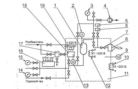 I - ресивер, 2-первичный термопреобразователь t1; 3- вакуумметр; 4- вакуумный насос; 5 - измерительное устройство сигналов с датчика давления; 6 - датчик давления; 7 - вентиль точной регулировки; 8 - насадок диффузионного горения; 9-первичный термопреобразователь t3; 10— нагреватель ЭЗ; 17 - емкость для воды; 18 - парогенератор; 19 - нагреватель Э2
