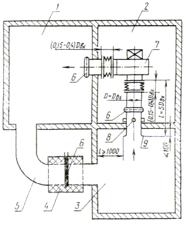 1 - перфорированный металлический лист (диаметр отверстий 6 мм, шаг - 10 мм), покрытый стеклотканью Э-01 или из полихлорвиниловых волокон; 2 - супертонкое стекловолокно, диаметр волокна 2 мкм; 3 - металл или фанера, поверхностная масса 4 кг/м2; 4 - перегородки Черт. 3 4.1.1.7. Конструкция концевого поглощающего устройства должна соответствовать черт. 3. 4.1.1.8. Испытательные трубы к вентилятору должны присоединяться при помощи гибких вставок длиной (0,15 - 0,4) Dвх, где Dвх - диаметр входного отверстия вентилятора. 4.1.1.9. Коэффициент отражения звукового давления концевого поглощающего устройства не должен превышать: 0,25 - в диапазоне 90 - 110 Гц, 0,15 - свыше 110 Гц. Методика определения коэффициента отражения приводится в рекомендуемом приложении 3. 4.1.1.10. Измерительный микрофон должен устанавливаться внутри ветрозащитной насадки (черт. 4). 4.1.1.11. Микрофон с ветрозащитной насадкой должен быть откалиброван в испытательной трубе. Методика определения частотной характеристики поправки на ветрозащитную насадку приводится в рекомендуемом приложении 4. Поправку на влияние потока воздуха в испытательной трубе принимают по графикам черт. 5. 4.1.1.12. Микрофон с ветрозащитной насадкой должен устанавливаться вдоль оси воздуховода в направлении к вентилятору в 3 положениях по сечению измерительного участка воздуховода на расстоянии 0,25Dтр, 0,33Dтр и 0,4Dтр от оси воздуховода. 4.1.1.13. Расстояние от микрофона до испытываемого вентилятора должно быть не менее 4Dтр. 4.1.2. Определение акустических характеристик вентиляторов по методу 1.2 Испытательная установка должна включать те же элементы, что и при измерении по методу 1.1, кроме концевого поглощающего устройства (см. черт. 2). 4.1.2.1. Минимальная длина испытательной трубы должна составлять 5 м. Остальные параметры испытательной трубы должны соответствовать требованиям п. 4.1.1. 4.2. Определение шумовых характеристик вентиляторов по методу II. 4.2.1. Испытательная установка должна включать испытываемый вентилятор, всасывающий и нагнетательный воздуховоды, присоединяемые к его входному и выходному отверстиям, помещения (камеры) для измерения производительности вентилятора и обходной канал с глушителем (черт. 6 - 9). Допускается на воздуховодах, противоположных измерительным, устанавливать концевое поглощающее устройство. 4.2.2. При наличии трех смежных помещений для измерения в среднем из них устанавливают вентилятор, а в смежные выводят всасывающий и нагнетательный воздуховоды (см. черт. 6). 4.2.4. Толщина стенок соединительных труб должна быть не менее 1,5 мм. Конструкция насадки на микрофон 1 - концевой обтекатель; 2 - держатель микрофона; 3 - микрофон; 4 - трубка со щелью, покрытой тканью; 5 - носовой обтекатель Черт. 4 Поправка на влияние потока воздуха в испытательной трубе Величина снижения чувствительности микрофона с трубчатой насадкой в октавных полосах частот в зависимости от скорости потока воздуха в испытательной трубе Черт. 5 4.2.5. Между вентилятором и соединительными трубами должны быть установлены гибкие патрубки длиной от 0,15 до 0,4Dвх (где Dвх - диаметр входного отверстия вентилятора). 1 - помещение для измерения шума нагнетания; 2 - помещение для измерения шума вокруг вентилятора; 3 - помещение для измерения шума всасывания; 4 - шумоглушитель; 5 - обходной канал, 6 - дросселирующее устройство; 7 - испытываемый вентилятор; 8 - место измерения произв
