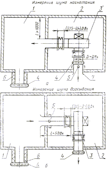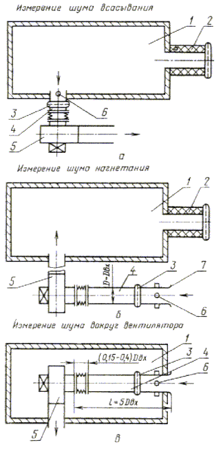 Постановлением Государственного комитета СССР по стандартам от 17 августа 1984 г. № 2909 срок действия установлен с 01.01.85 Ограничение срока действия отменено Настоящий стандарт распространяется на одноступенчатые радиальные вентиляторы по ГОСТ 5976-73 и одноступенчатые осевые вентиляторы по ГОСТ 11442-74, имеющие рабочие колеса диаметром от 200 до 5000 мм, и устанавливает методы определения шумовых характеристик. Стандарт полностью соответствует СТ СЭВ 4209-83. 1. ОБЩИЕ ПОЛОЖЕНИЯ1.1. Акустические испытания вентиляторов проводят для установления и проверки соответствия их паспортным данным и подвергают периодической проверке серийно выпускаемых вентиляторов. 1.2. Определяемые при испытаниях вентиляторов шумовые характеристики предназначены для: оценки шума, распространяющегося по воздуху и излучаемого в присоединяемые воздуховоды или окружающее пространство; сопоставления по шумовым характеристикам вентиляторов различных типов; акустических расчетов при проектировании оборудования, составной частью которого является вентилятор. 1.3. Термины и определения - по ГОСТ 23941-79. Краткие пояснения основных понятий, используемых в настоящем стандарте, приведены в приложении 1. Lрвс.в - во всасывающем воздуховоде вентилятора; Lрнг.в - в нагнетательном воздуховоде вентилятора; Lрвс - всасывания вентилятора; Lрнг - нагнетания вентилятора; Lрк - вентилятора в окружающем пространстве; Lрс - вентилятора, установленного в стене. 1.5. При определении шумовых характеристик вентиляторов результаты измерений выражают следующими показателями: уровнями звуковой мощности Lpi и уровнями звукового давления Li в одной из контрольных точек на расстоянии R = 1; 3; 5; 10 м в октавных полосах со среднегеометрическими частотами от 125 до 8000 Гц; корректированным уровнем звуковой мощности LPA. Допускаются измерения на более низких или более высоких частотах и в третьоктавных полосах со среднегеометрическими частотами от 100 до 10000 Гц. Допускается приводить значения показателей суммарного уровня звуковой мощности Lpå или других характеристик по ГОСТ 23941-79. (Измененная редакция, Изм. № 2). 1.6. Для определения шумовых характеристик вентиляторов применяют следующие методы: при определительных испытаниях: I - метод измерений внутри воздуховода, присоединенного к вентилятору; II-метод отраженного звукового поля в соответствии с ГОСТ 12.1.027-80; III - метод свободного звукового поля в соответствии с ГОСТ 12.1.026-80; при всех видах контрольных испытаний - любой из методов I, II, III или ориентировочный метод IV в соответствии с ГОСТ 12.1.028-80. 1.7. Требования к средствам измерений, аппаратуре и уровням помех, оценка качества звукового поля, порядок проведения измерений и классификация точности результатов измерений должны соответствовать ГОСТ 23941-79, ГОСТ 12.1.026-80, ГОСТ 12.1.027-80, ГОСТ 12.1.028-80 и настоящему стандарту. 2. АППАРАТУРА2.1. Аппаратура, применяемая для измерения шума, должна соответствовать ГОСТ 12.1.026-80, ГОСТ 12.1.27-80 и ГОСТ 12.1.028-80. Образцовый источник шума должен соответствовать требованиям ГОСТ 12.1.025-81. (Измененная редакция, Изм. № 1). 3. ПОДГОТОВКА К ИСПЫТАНИЮ3.1. Вентилятор, подвергающийся испытаниям, должен соответствовать техническим условиям. 3.2. Полная аэродинамическая характеристика вентилятора должна быть предварительно определена в соответствии с ГОСТ 10921-74. 3.3. Шумовые характеристики вентиляторов должн
