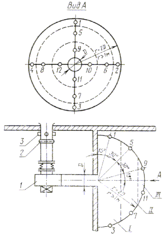Черт. 1 4. ПРОВЕДЕНИЕ ИЗМЕРЕНИЙ4.1. Определение шумовых характеристик вентиляторов по методу I Измерения данным методом подразделяют на измерения в воздуховоде диаметром до 1200 мм с концевым поглощающим устройством (метод 1.1) и измерения в воздуховоде диаметром свыше 1200 мм без концевого поглощающего устройства (метод 1.2). 4.1.1. Определение шумовых характеристик в воздуховоде по методу 1.1 Испытательная установка (черт. 2) должна включать испытываемый вентилятор, испытательную трубу, присоединенную к его всасывающему и нагнетательному отверстию, устройство для регулирования режима работы и измерения производительности вентилятора. 1 - испытываемый вентилятор; 2 - гибкая вставка; 3 - переходный участок; 4 - микрофон с ветрозащитной насадкой (см. черт. 8); 5 - концевое поглощающее устройство; 6 - дросселирующее устройство; 7 - места измерения производительности; 8 - измерительный коллектор; 9 - измерительный участок трубы; 10 - глушитель (рекомендуемый) Черт. 2 4.1.1.1. Испытательная труба, присоединяемая к вентилятору, должна включать переходный и измерительный участки, концевое поглощающее устройство и входной участок с измерительным коллектором (на стороне всасывания или нагнетания). 4.1.1.2. Испытательная труба должна иметь круглое сечение. 4.1.1.3. (Исключен, Изм. № 2). 4.1.1.4. Длина измерительного участка испытательной трубы между переходным участком и концевым поглощающим устройством не должна быть менее 5 диаметров трубы и менее 4 м. Отношение площадей S/Sв поперечного сечения измерительного участка S к площади входного или выходного сечения Sв переходных участков всасывающей и нагнетательной труб должно находиться в пределах от 0,7 до 2,0. Угол раскрытия переходного участка не должен превышать 15°. (Новая редакция, Изм. № 2). 4.1.1.5. Входной участок испытательной трубы с измерительным коллектором (на стороне всасывания) должен соответствовать схеме (черт. 2). 4.1.1.6. Толщина стенок испытательных труб должна быть не менее 1,5 мм. Примечание. Допускается покрытие стенок с наружной стороны вибропоглощающим материалом.