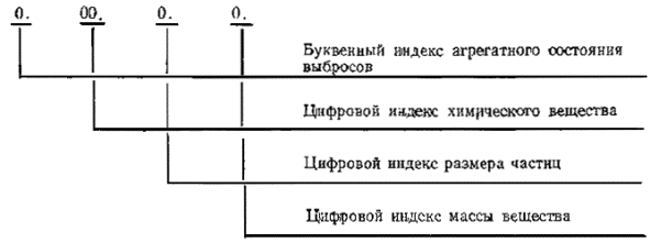 При отсутствии какого-либо индекса ставят цифру 0. Примеры условных обозначений: выброс жидкий, содержащий щелочь с размером частиц от 0,5 до 3 мкм с массой вещества 70 кг/ч: К.21.2.3, выброс, состоящий из смеси окиси углерода с массой 60 кг/ч и паров ароматических углеводородов с массой 5 кг/ч: А.02.0.3.А.15.0.2, выброс, состоящий из сернистого ангидрида с массой 2000 кг/ч, кислоты размером частиц от 0,5 до 3 мкм и массой 50 кг/ч, сажи с размером части 1 мкм и массой 60 кг/ч: А.01.0.5.К.20.2.3.Т.23.2.3». (Измененная редакция, Изм. №1). |
