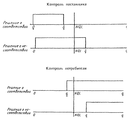 продукции; Рисунок 3 - Правила принятия решений при контроле поставщика и контроле потребителя для односторонних требований к групповому показателю качества. Потребитель может повысить значение среднего по схеме риска потребителя при контроле поставщика в зависимости от степени доверия к информации поставщика о качестве продукции вплоть до значения b0 = 1, соответствующего приемке без контроля поставщика, по доверию потребителя. 5.8.3. Применение схем СПК потребителем при входном контроле допускается, если продукция поступает к нему от одного изготовителя в той же последовательности, в которой была изготовлена и проконтролирована поставщиком. Если на входной контроль потребителя поступает продукция в другой последовательности или от разных поставщиков (изготовителей), то потребитель должен осуществлять контроль одиночных партий, не объединяя их в контролируемую последовательность с использованием схем контроля. 6 НОРМАТИВНОЕ И МЕТОДИЧЕСКОЕ ОБЕСПЕЧЕНИЕ СТАТИСТИЧЕСКОГО ПРИЕМОЧНОГО КОНТРОЛЯ КАЧЕСТВА.6.1 Конкретные схемы и планы СПК на определенный вид продукции, группы показателей или отдельные показатели качества продукции должны быть включены в программы - методики контроля качества продукции (далее - методики контроля) - односторонние документы соответственно изготовителя (поставщика), потребителя или третьей стороны. Методики контроля должны иметь статус стандартов предприятий (фирм, организаций, обществ, ассоциаций). Допускается включать методики контроля в технические условия. При заключении договоров на поставку изготовитель (поставщик) должен указать ссылку на соответствующую методику контроля. По требованию потребителя изготовитель (поставщик) обязан ознакомить потребителя с методикой контроля или приложить ее к договору. Аналогично потребитель или третья сторона при предъявлении поставщику претензий к качеству продукции обязаны по требованию поставщика предоставить ему методики контроля. При наличии методик контроля, имеющих статус международных, межгосударственных или государственных стандартов, при их прямом применении для выбора планов и схем контроля необходимо в договорах или технических условиях указывать ссылки на эти стандарты. 6.2. Стороны должны вести протоколы контроля, в которых необходимо указывать используемые для конкретных партий или периодов времени планы и схемы контроля, а также полученные результаты. Поставщик обязан хранить указанные протоколы в течение сроков, оговоренных в контракте (договоре). Допускается хранение протоколов контроля на магнитных носителях. Поставщик обязан предоставлять протоколы контроля потребителю по его требованию, а при контроле обязательных требований международных или государственных стандартов - органам государственного надзора и соответствующим, сертификационным центрам. 6.3. Нормативно-методической базой для системы согласованных планов и схем контроля поставщика, потребителя и третьей стороны являются: - настоящий государственный стандарт; - международные, межгосударственные, государственные стандарты, включающие в себя каталоги типовых планов и схем СПК для диапазона значений рисков и (или) уровней доверия, соответствующих требованиям раздела 5; - международные, межгосударственные, государственные стандарты, устанавливающи