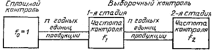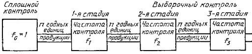 5.2 Приемка отдельных единиц продукции При применении поставщиком, НСПК решение о возможности приемки и поставки отдельных единиц продукции потребителю без контроля принимается только по правилам допустимых планов НСПК поставщика, удовлетворяющих требованиям настоящего стандарта (если иные правила приемки не предусмотрены в договоре на поставку и его приложениях). 5.3 Допустимые планы НСПК поставщика План НСПК поставщика является допустимым, если максимальное значение средней доли единиц продукции, принимаемых без контроля по данному плану при уровне несоответствий в потоке продукции выше NQL, не превышает установленного нормативного значения риска потребителя. Таблицы каталога настоящего стандарта (см. приложение А) содержат допустимые планы НСПК поставщика для соответствующих значений NQL и степеней доверия (нормативных значений риска потребителя). 6 СТАТИСТИЧЕСКИЙ ПРИЕМОЧНЫЙ КОНТРОЛЬ ПОТРЕБИТЕЛЯ И ТРЕТЬЕЙ СТОРОНЫ6.1 Контроль потребителя Потребитель для решения своих внутренних задач может применять любые планы НСПК для входного контроля продукции, поступившей от поставщика. При обнаружении несоответствия единиц продукции по усмотрению потребителя продукция может быть использована по назначению, возвращена поставщику для устранения несоответствия за счет поставщика или возвращена с возмещением ущерба, если иные правила не указаны в договоре. Претензии к поставщику в отношении качества совокупности поступившей продукции могут быть предъявлены только при условии формирования ее в партию и проведения выборочного входного контроля этой партии по планам статистического приемочного контроля (СПК) потребителя в соответствии с правилами, установленными в государственных стандартах на статистический приемочный контроль партий продукции. 6.2 Контроль третьей стороны Применение НСПК третьей стороной - по правилам, установленным ГОСТ Р 50779.52. 7 МНОГОСТАДИЙНЫЕ ПЛАНЫ НЕПРЕРЫВНОГО СТАТИСТИЧЕСКОГО ПРИЕМОЧНОГО КОНТРОЛЯ7.1 Параметры планов непрерывного контроля Планы НСПК из каталога данного стандарта (см. приложение А) определяются следующими параметрами: k - число стадий выборочного контроля; d - коэффициент ослабления контроля от стадии к стадии; n - длина стадии, т.е. число изделий, контролируемых на каждой стадии; С - приемочное число (максимально допустимое число несоответствующих единиц продукции среди n проконтролированных единиц продукции, используемое при принятии решения об ослаблении контроля); R - браковочное число (минимальное число несоответствующих единиц продукции среди n проконтролированных единиц продукции, используемое при принятии решения об усилении контроля). Схемы одно-, двух- и трехстадийных планов приведены соответственно на рисунках 1; 2 и 3, где f0 - частота стадии сплошного контроля (f0=1), a f1, f2, f3 - частоты на соответствующих стадиях выборочного контроля. 7.2 Предварительные замечания Все планы каталога настоящего стандарта включают в себя стадию сплошного контроля и стадии выборочного контроля. На стадии сплошного контроля проводят проверку каждой единицы продукции. а) R = l - возврат на сплошной контроль при обнаружении первой, несоответствующей единицы продукции; б) R = 2 - возврат на сплошной контроль при обнаружении двух несоответствующих единиц продукции среди n проконтролированных и сохра