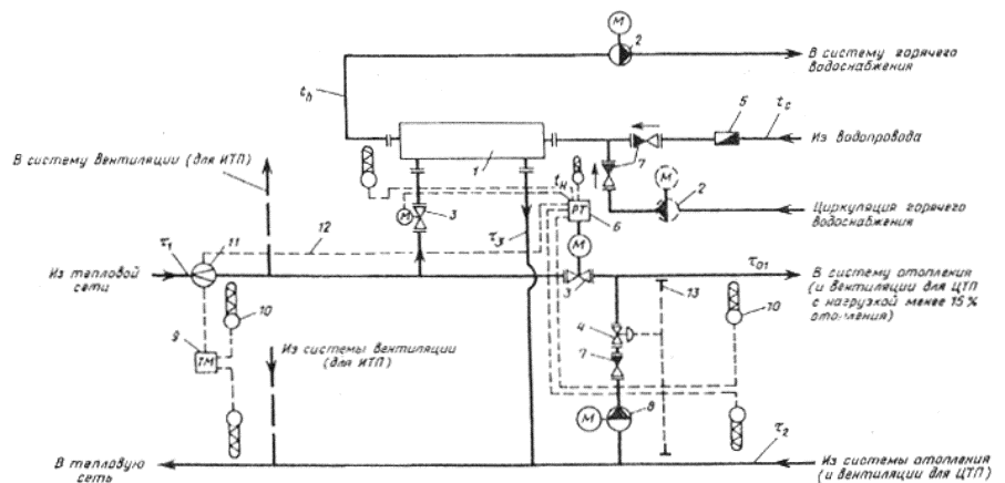 соотношении При применении двухступенчатой схемы по рис. 8 для жилых и общественных зданий с максимальным тепловым потоком на вентиляцию менее 15 % максимального теплового потока на отопление водоподогреватель 2-й ступени в отопительный период работает по перемычке с задвижкой А (по предвключенной схеме), а перемычка с задвижкой Б предусматривается для работы в летний период. При применении этой схемы в производственных зданиях или на группу общественных зданий с тепловым потоком на вентиляцию более 15 % теплового потока на отопление перемычка с задвижкой А в схеме на рис. 8 не предусматривается, водоподогреватель работает в наличии всего года по перемычке с задвижкой Б по смешанной схеме. 3.20 Приведенные схемы присоединения потребителей теплоты к тепловым сетям не охватывают всех возможных вариантов. Могут применяться также другие схемы присоединения потребителей теплоты к тепловым сетям, обеспечивающие минимальный расход воды в тепловых сетях, экономию теплоты за счет применения регуляторов расхода теплоты и ограничителей максимального расхода сетевой воды, корректирующих насосов или элеваторов с автоматическим регулированием, снижающих температуру воды, поступающей в системы отопления, вентиляции и кондиционирования воздуха. 3.21 При теплоснабжении от котельной мощностью 35 МВт и менее при технико-экономическом обосновании допускается присоединение к тепловым сетям водоподогревателей систем горячего водоснабжения по одноступенчатой схеме (см. рис. 1 и 7) независимо от соотношения тепловых нагрузок систем горячего водоснабжения и отопления. 3.22 В закрытых системах теплоснабжения при присоединении к тепловым сетям систем горячего водоснабжения с циркуляционным трубопроводом (см. рис. 1 - 8) должны предусматриваться циркуляционные или повысительно-циркуляционные насосы в соответствии с требованиями СНиП 2.04.01-85. 3.23 При двухступенчатых схемах присоединения водоподогревателей систем горячего водоснабжения с принудительной циркуляцией воды циркуляционный трубопровод рекомендуется присоединять к трубопроводу нагреваемой воды между водоподогревателями I и II ступеней, а при параллельной схеме присоединения - к трубопроводу холодной водопроводной воды или к трубопроводу нагреваемой воды между секциями водоподогревателя. 3.24 Горячее водоснабжение в открытых системах теплоснабжения должно присоединяться к подающему и обратному трубопроводам двухтрубных водяных тепловых сетей через регулятор смешения воды (рис. 9) для подачи в систему горячего водоснабжения воды заданной температуры. Отбор воды для горячего водоснабжения из трубопроводов и приборов систем отопления не допускается. 3.25 В открытых системах теплоснабжения циркуляционный трубопровод системы горячего водоснабжения рекомендуется присоединять к обратному трубопроводу тепловой сети после отбора воды в систему горячего водоснабжения (рис. 9, а), при этом на трубопроводе между местом отбора воды и местом подключения циркуляционного трубопровода должна предусматриваться диафрагма, рассчитанная на гашение напора, равного сопротивлению системы горячего водоснабжения в циркуляционном режиме. 3.26 В открытых системах теплоснабжения при давлении в обратном трубопроводе тепловой сети, недостаточном для подачи воды в систему горячего водоснабжения