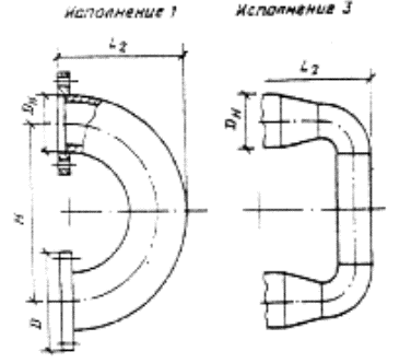 Рис. 2. Конструктивные размеры водоподогревателя 1 - секция; 2 - калач; 3 - переход; 4 - блок опорных перегородок; 5 - трубки; 6 - перегородка опорная; 7 - кольцо; 8 - пруток; Рис. 3. Калач соединительный Рис. 4. Переход Таблица 1 Технические характеристики водоподогревателей по ГОСТ 27590