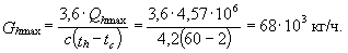4. Максимальный расход нагреваемой воды, кг/ч, проходящей через I и II ступени водоподогревателя, следует рассчитывать исходя из максимального теплового потока на горячее водоснабжение Qhmax, определяемого по формуле 2 прил. 2, и нагрева воды до 60 °С во II ступени:
